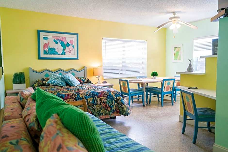 This room is equipped with cable TV, a microwave, refrigerator, and a dining area.